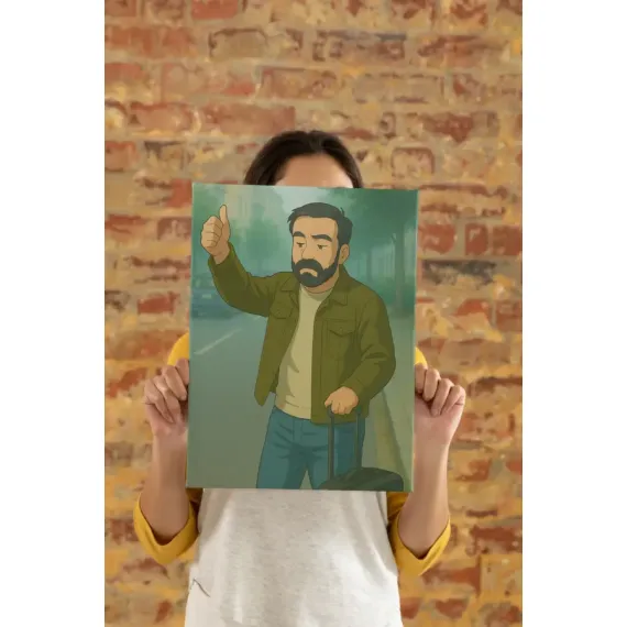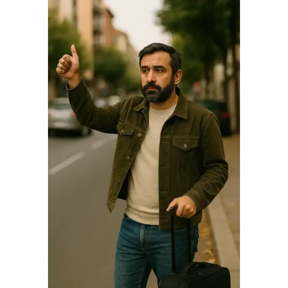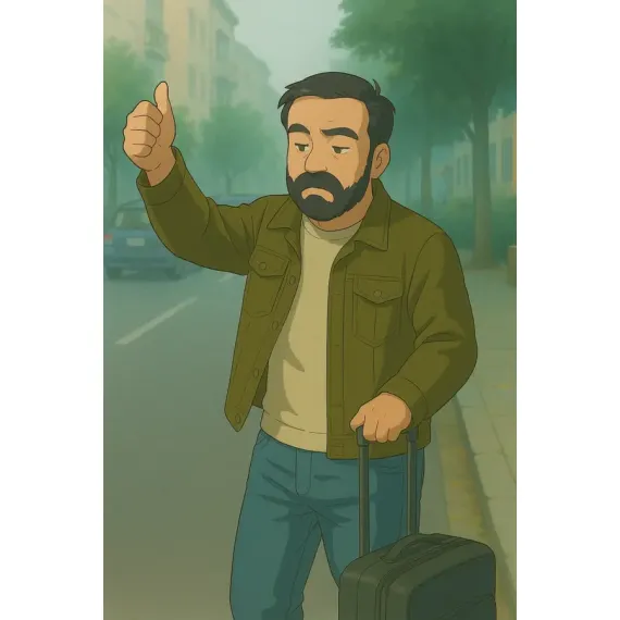 En esta escena, un hombre con maleta levanta el pulgar con resignación, esperando quizá un coche o una señal del destino. Su mirada, entre nostálgica y decidida, cuenta más de lo que mil palabras podrían. Esta imagen, aparentemente sencilla, guarda el eco de muchas despedidas, comienzos o viajes interiores.