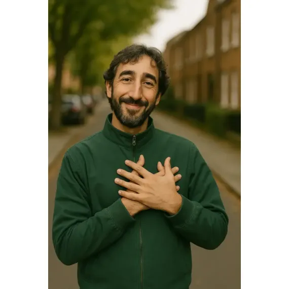 Hay miradas que no necesitan palabras, y gestos que lo dicen todo. Este hombre, con las manos sobre el pecho y una expresión cálida, parece estar diciendo “gracias” con todo el cuerpo. Una gratitud serena, que llega directo, sin rodeos.
