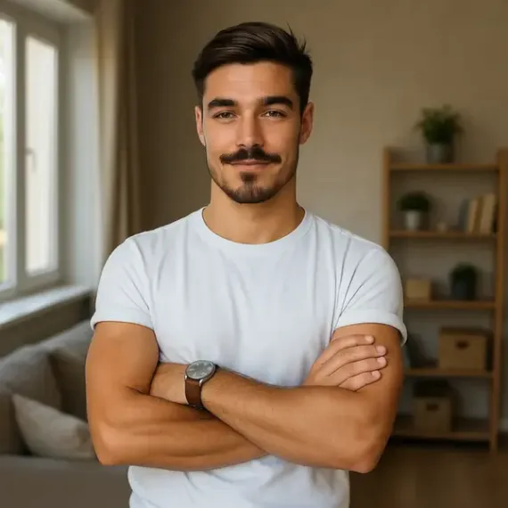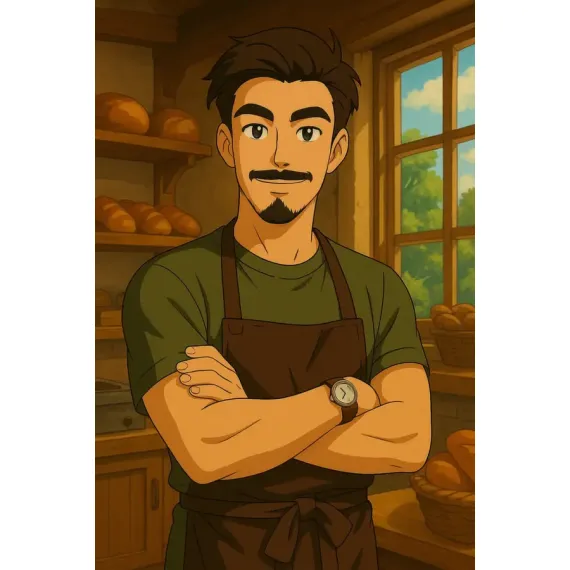Hay oficios que se llevan en el cuerpo. Basta mirar esos brazos cruzados, esa sonrisa serena, ese delantal que huele a masa recién hecha. Este hombre no está posando: está presentando su orgullo.