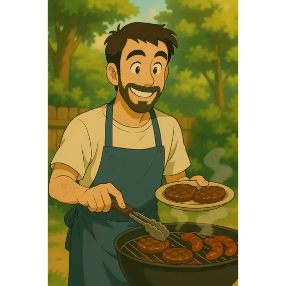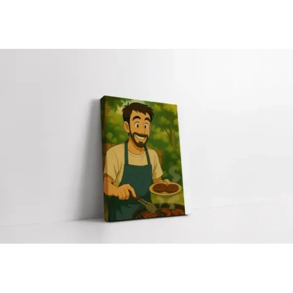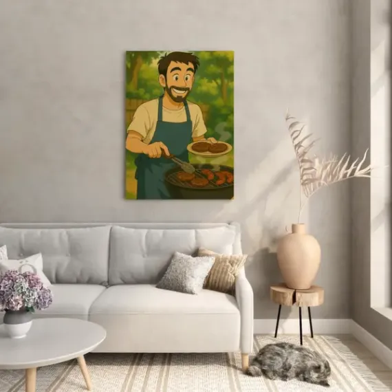 No hay reunión familiar sin parrilla, ni parrilla sin ese personaje entrañable que sonríe con la pinza en mano y el delantal al cuello. Este momento, tan cotidiano como inolvidable, es el alma de esta foto lienzo.