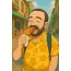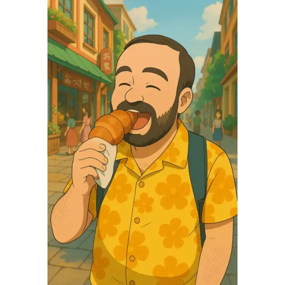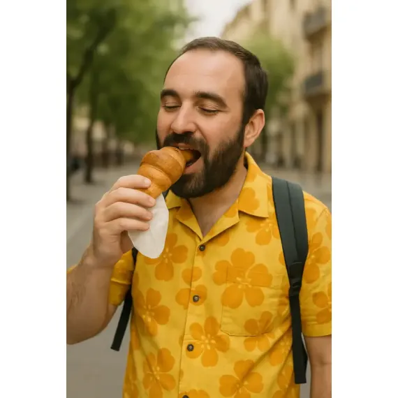 Hay placeres que no necesitan explicación: un paseo, buen tiempo, y ese primer mordisco que sabe a vacaciones. Este hombre, con camisa tropical, mochila y una sonrisa que casi se oye, representa a quienes saben saborear la vida con ganas.