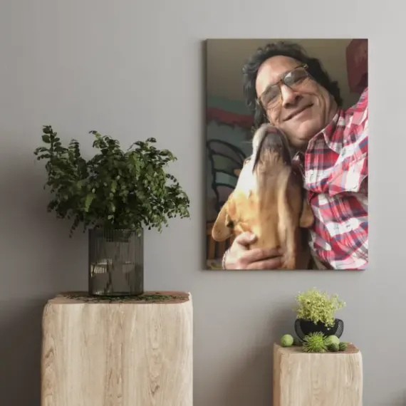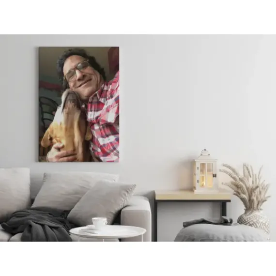 Esta foto lienzo es un homenaje a esa lealtad que te recibe con salto cada vez que cruzas la puerta. Un producto personalizado ideal para imprimir momentos de ternura auténtica que no necesitan filtros ni poses. Porque lo importante está en esa mirada de perro sabio y en ese abrazo que se da con las dos manos… y el corazón.