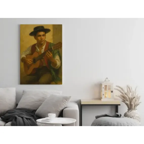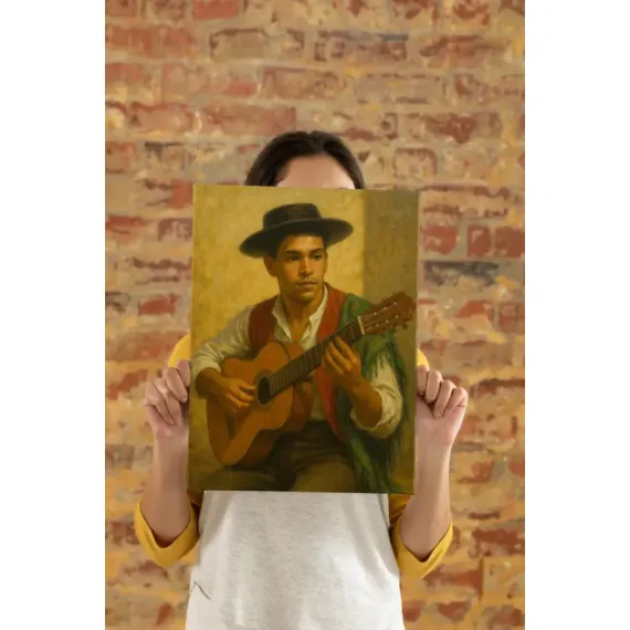 Dicen que hay momentos que suenan. Este es uno de ellos. No sabemos si tocaba bulerías o simplemente posaba antes de empezar, pero su mirada lo dice todo: concentración, arte y un pellizco de melancolía. En Regalio, tomamos esa foto con alma y la convertimos en un producto personalizado que parece pintado a mano por un viejo maestro andaluz.