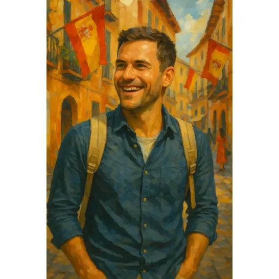 Hay sonrisas que nacen del alma y tienen acento español. Como esa que surge cuando caminas por las calles de Madrid o Sevilla, con el sol acariciando las fachadas y una bandera ondeando a lo lejos. Esta foto, ahora transformada en un cuadro en Regalio, captura no solo una expresión, sino una emoción entera.