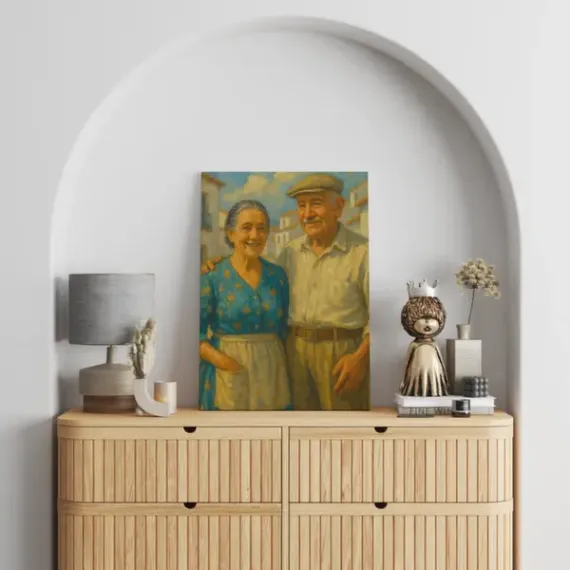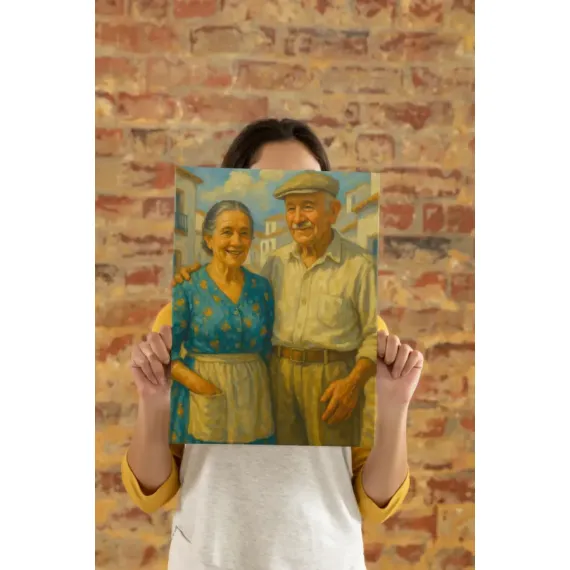 Con el estilo acogedor de los pueblos blancos y la luz tibia de la memoria, este producto personalizado no solo es una obra decorativa: es un canto a la ternura, a los domingos de cocido y a los silencios compartidos. Regalio sabe imprimir lo que otros apenas intuyen: el alma de quienes amamos.
